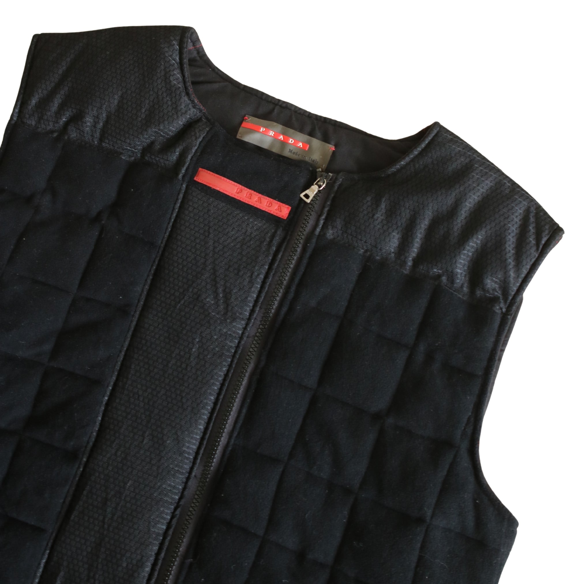 Part of the Akira Towel reworked collection, this gilet is crafted from a damaged hoodie and transformed into a Prada Sport piece with off-centre zip fastening and grid-stitch padding. Completed with the iconic red rubber branding on the chest, the piece nods to Neil Barrett’s creative approach of deconstructing and reinterpreting classic sportswear, blending technical detailing with bold, contemporary design.