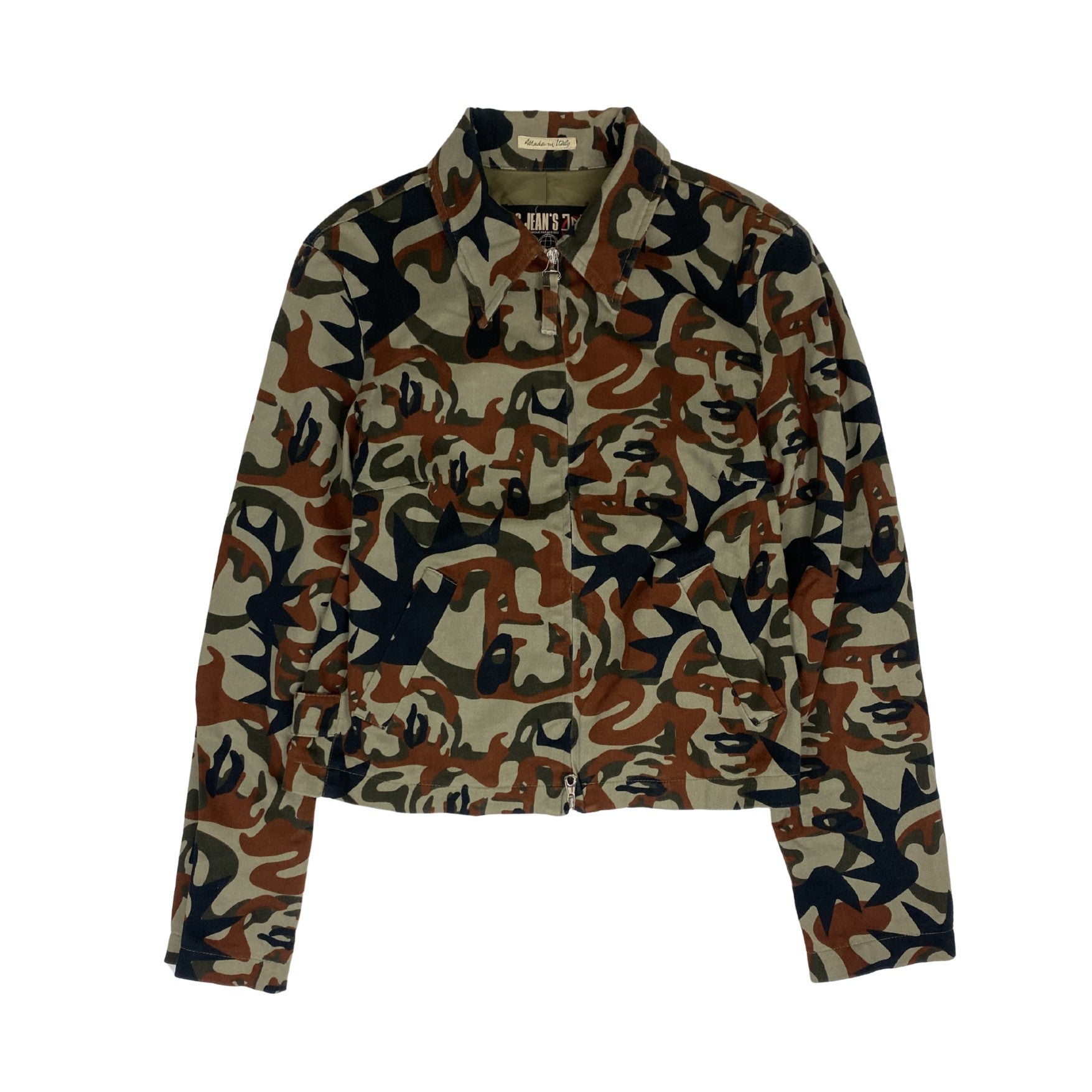 The Jean Paul Gaultier AW2001 Punk Faces Camou Work Jacket fuses workwear structure with a bold camo print featuring punk-inspired face motifs. Crafted with durable fabrics and tailored panels, it’s a distinctive piece that balances utility with avant-garde detailing.