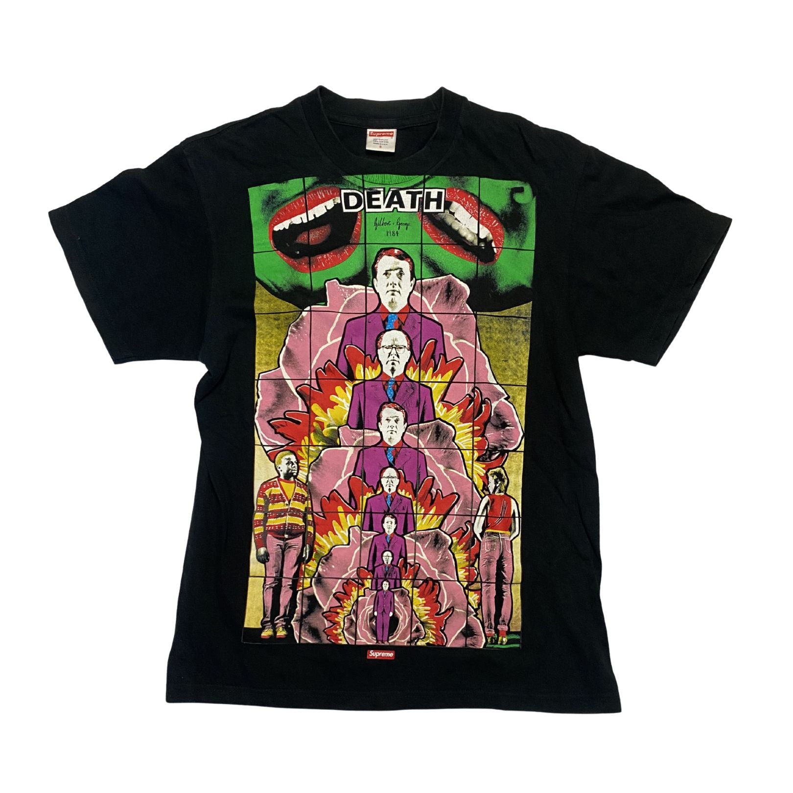 The Supreme x Gilbert & George Death T-Shirt pulls directly from the duo’s provocative visual language — bold typography, stark composition, and that unmistakable tension between beauty and morbidity. Printed across a premium cotton base, the graphic lands loud and unapologetic, staying true to both Supreme’s downtown edge and Gilbert & George’s confrontational art practice.